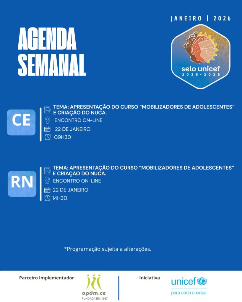 Atenção municípios! Confira a programação desta semana para os municípios do Selo UNICEF no Ceará e Rio Grande do Norte. Os encontros on-line desta semana irão apresentar o curso “Mobilizadores de Adolescentes” e o status municipal a respeito da criação do NUCA. As atividades são voltadas para os(as) articuladores(as) municipais e mobilizadores(as) de adolescentes dos …